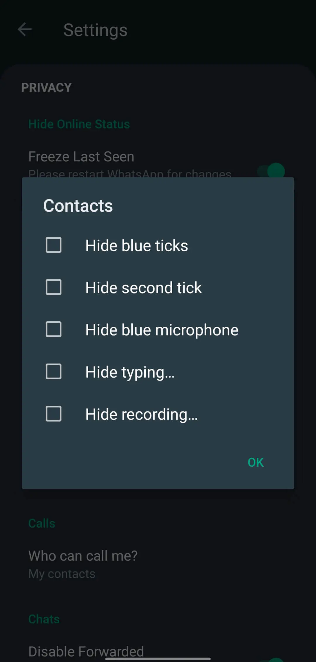 | Hide Blue/Second Ticks | Yes, hide while still seeing others’ ticks | No, disabling read receipts works both ways |